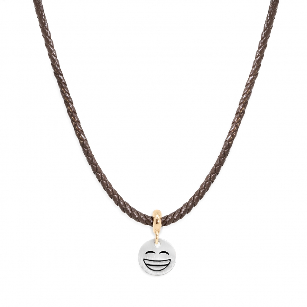 Per impreziosire il tuo collo o quello di una persona a te cara, scegli la collana realizzata in cuoio marrone con Stopper in argento 925 che esprime felicità.