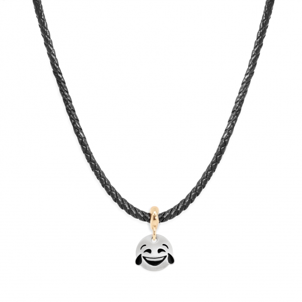 Per impreziosire il tuo collo o quello di una persona a te cara, scegli la collana realizzata in cuoio nero con Stopper in argento 925 che esprime divertimento.